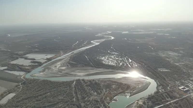 4月7日,在塔里木河轮台段,从高空俯瞰,蜿蜒的塔里木河如一条碧绿的玉带,镶嵌在广袤的荒漠之中。河岸两侧,数百万亩胡杨林连绵铺展,苍劲的枝干在澄澈的蓝天之下舒展,虽未完全抽叶,却已被串串花序缀满,在春日暖阳里晕开一片温柔的棕红。在这盛花期间,当地林草部门开展多项工作,守护原始胡杨林的独特春色。